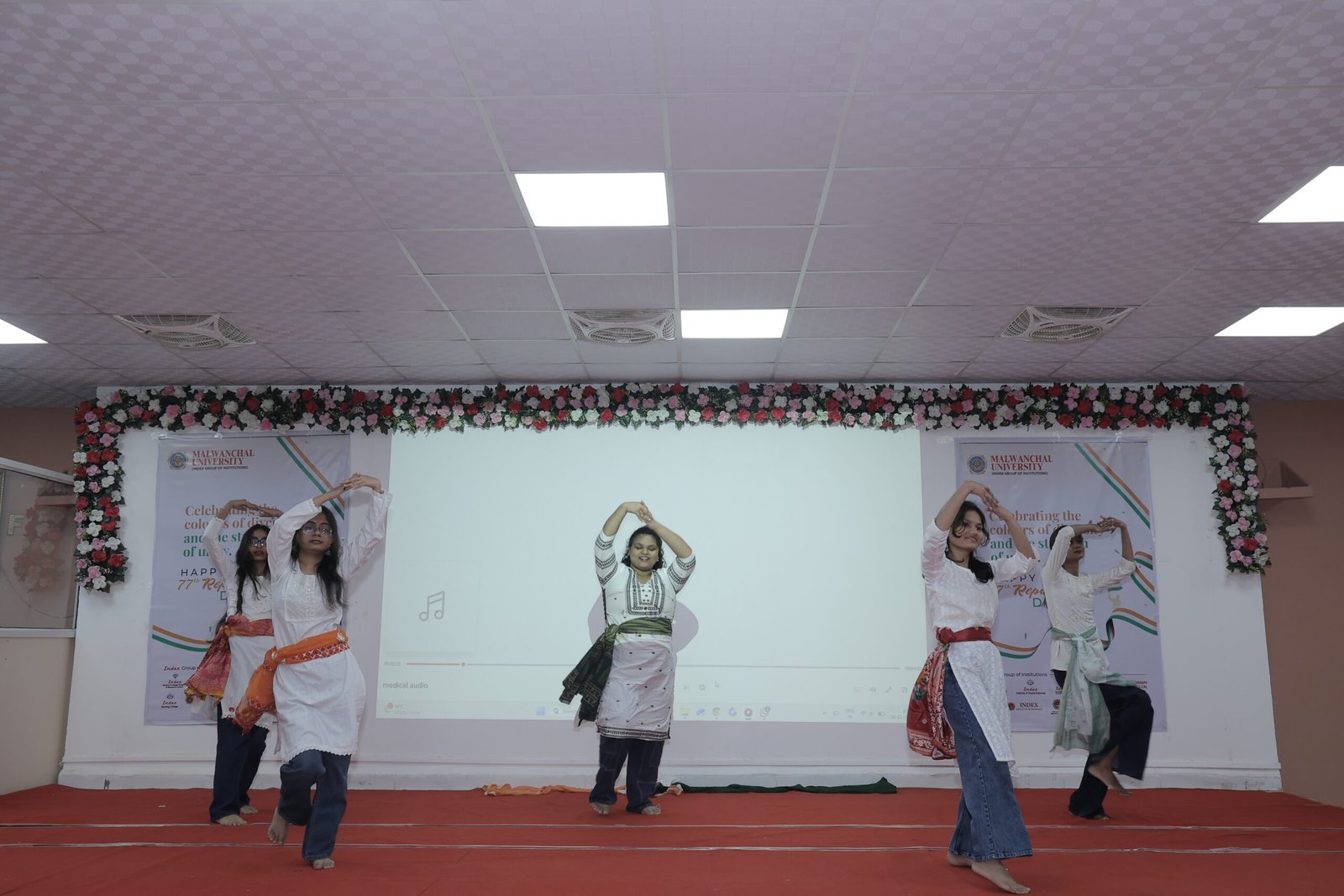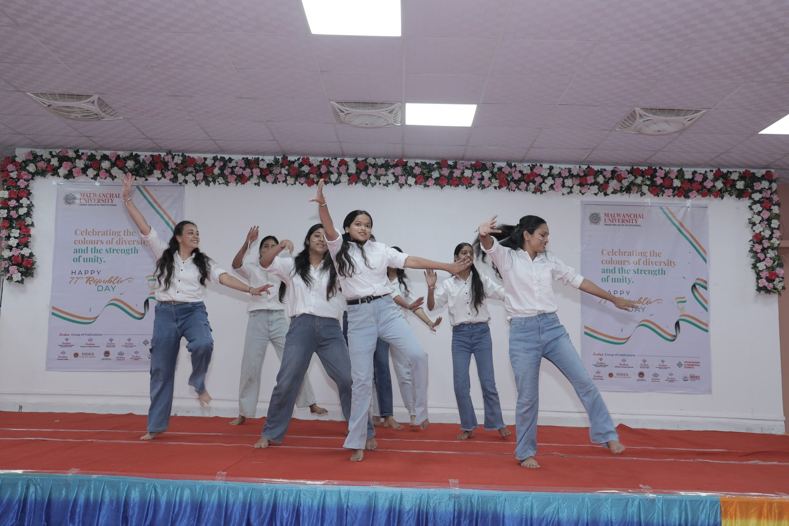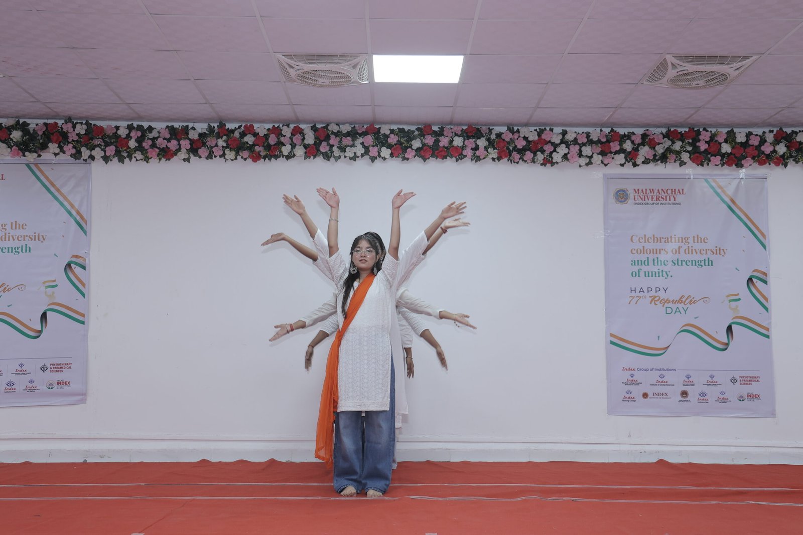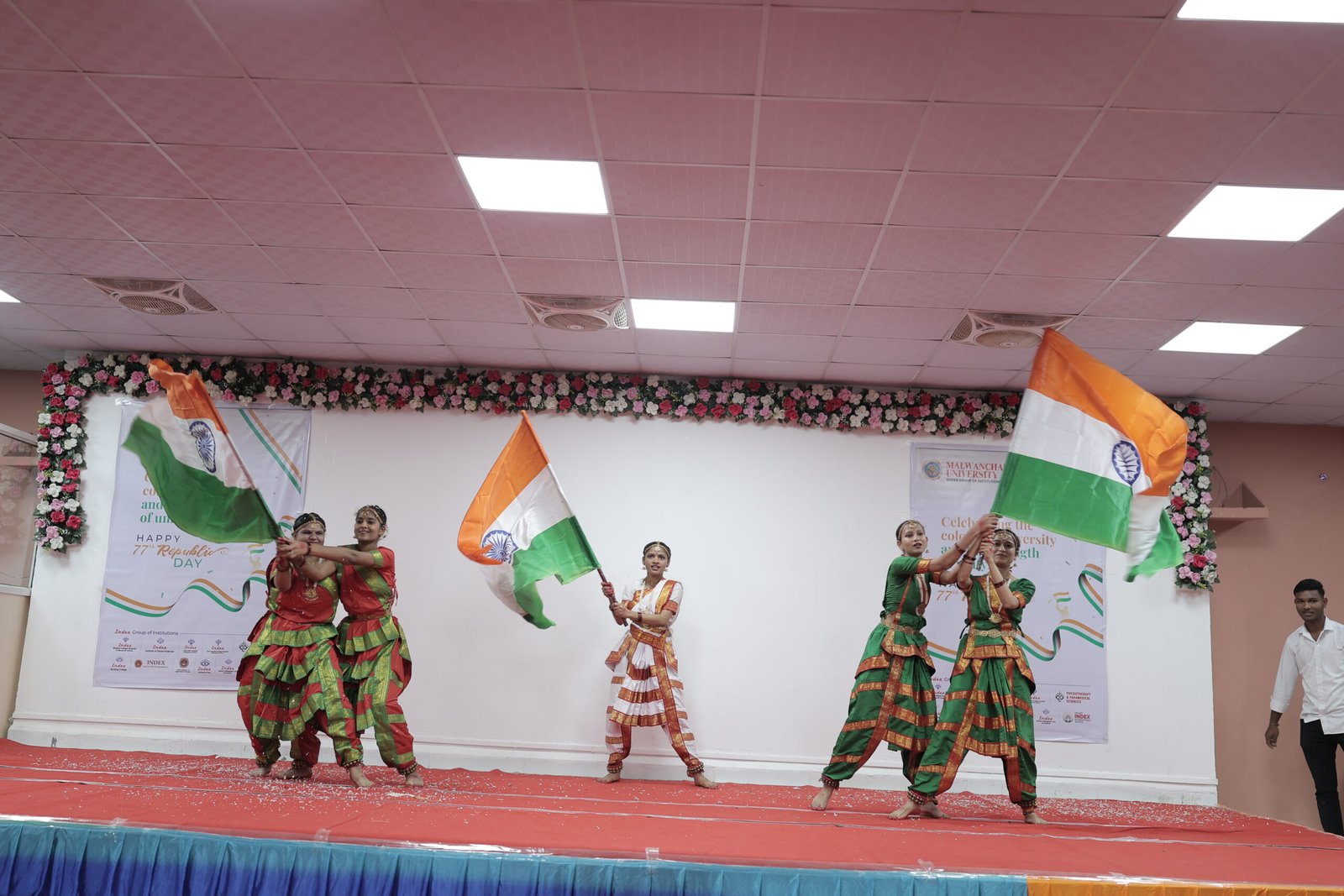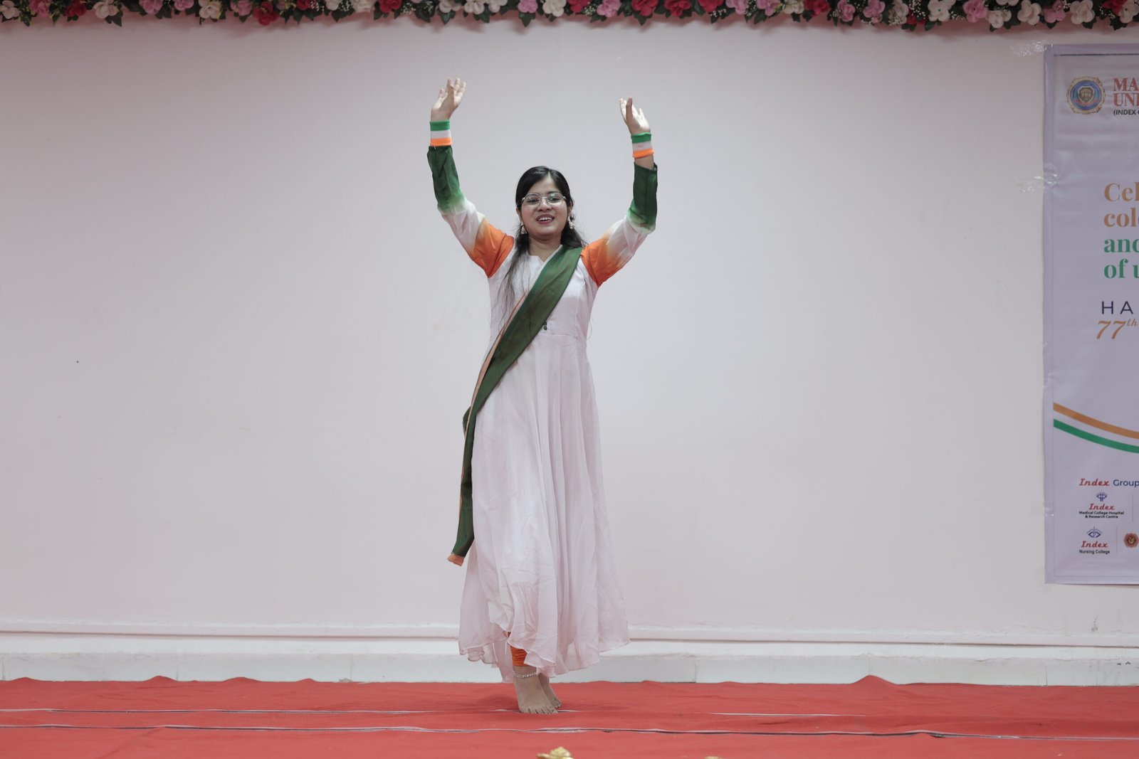 The Republic Day celebration was enriched by a series of inspiring cultural performances presented by students of various Index Group institutions. Students of Index Medical College delivered a compelling tribute to the Indian Armed Forces, portraying the courage, discipline, and sacrifices of the nation’s soldiers. A powerful stage play depicting the lives of martyred soldiers emotionally connected the audience to the spirit of patriotism and service. Patriotic songs and synchronized dance performances further elevated the atmosphere, creating a vibrant yet respectful celebration that honored the nation’s rich heritage and the values of freedom, sacrifice, and unity.