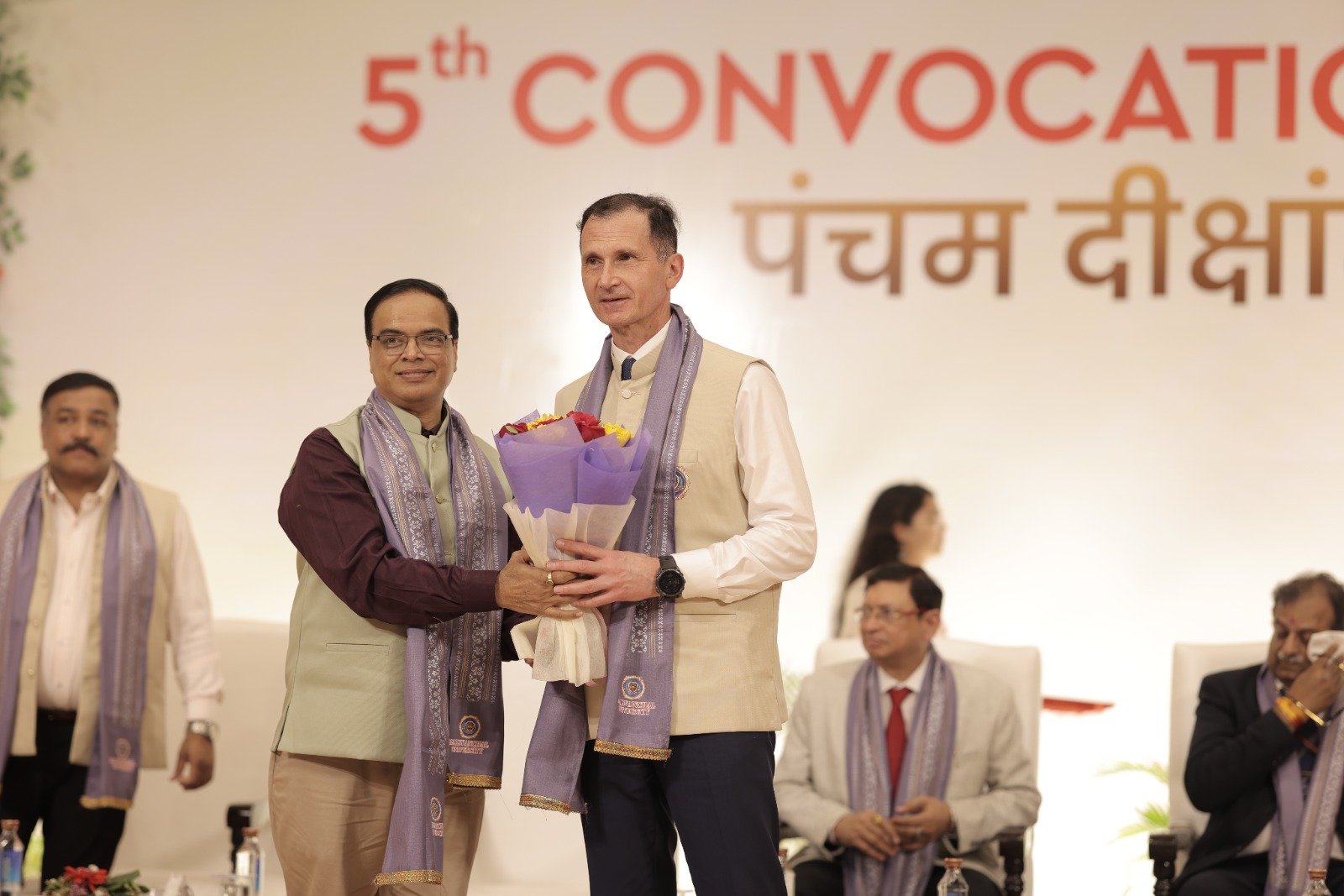 The event was further elevated by the presence of Hon’ble Guest Dr. Dragan Primorac, an internationally acclaimed pediatrician, geneticist, and forensic expert, ranked among the top two percent of scientists globally. Widely recognized for his pioneering work in DNA analysis, molecular genetics, and personalized medicine, he has contributed extensively to global scientific advancements. A former Minister of Science, Education, and Sports of Croatia, his distinguished career, academic contributions, and global associations made his presence deeply inspiring for students and faculty alike. The ceremony was also attended by Rajesh Vyas, former US Foreign Service Medical Officer, adding further distinction to the event. Their collective presence underscored the global outlook and academic strength that Malwanchal University continues to foster.