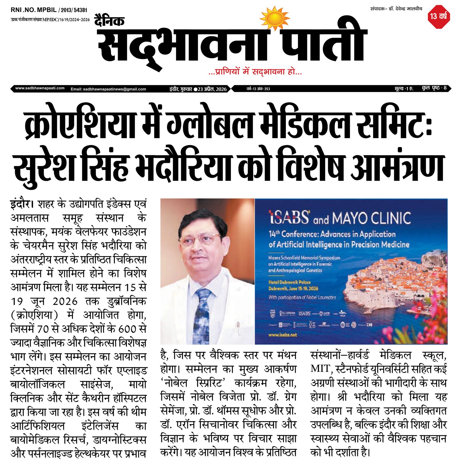 Mayank Welfare Foundation Chairman Suresh Singh Bhadoria Invited to Global AI in Precision Medicine Conference in Croatia