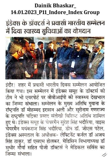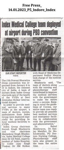The 17th Pravasi Bharatiya Divas convention was organised from January 8 to January 10, 2023 in Indore. Students of Index Department of physiotherapy & Paramedical sciences deployed especially for 24 hrs medical facilities for VVIPs at Devi Ahilyabai Holkar International Airport.
