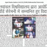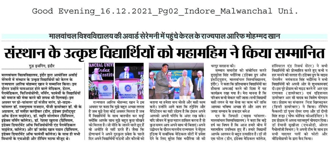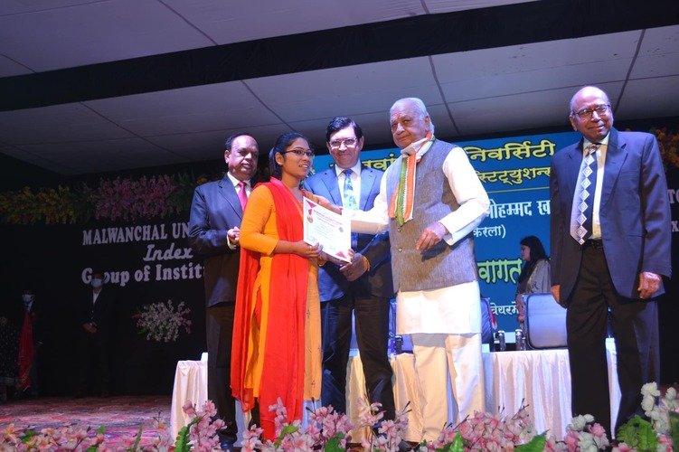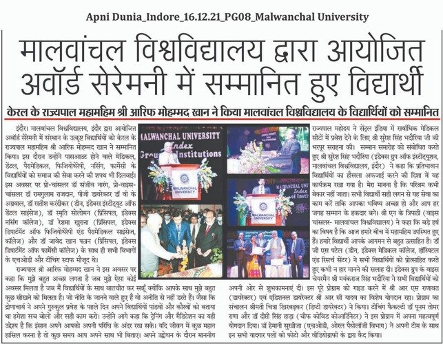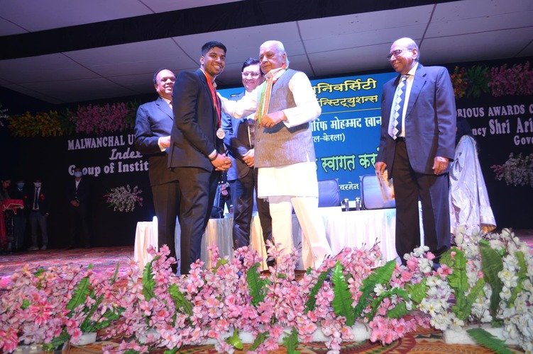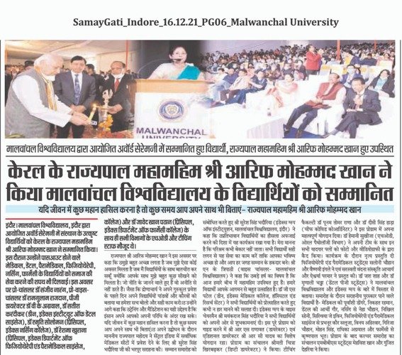 The outstanding students of the Malwanchal University were honored by the Governor of Kerala Mr. Arif Mohammed Khan at the award ceremony organized by Malwanchal University, Indore on 15th December 2021.