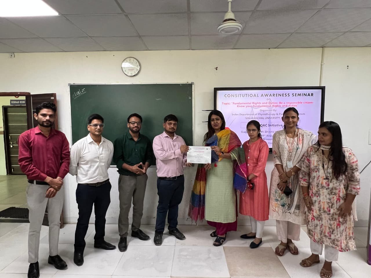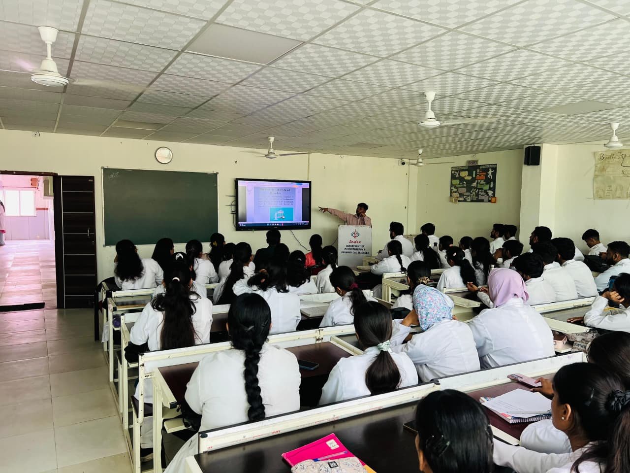 The Index Department of Physiotherapy and Paramedical Sciences (IDOPT) organized an insightful seminar on Fundamental Rights and Duties on 6th August 2025 at the First Floor Classroom, IDOPT. The session was graced by Mr. Bhisma Kumar Dehariya as the Guest Speaker, who engaged the students in a meaningful discussion about the constitutional rights and responsibilities of every citizen. The program, held under the initiative of IQAC, was organized with the inspiration and guidance of Shri Suresh Singh Bhadoria, Chairman, Index Group of Institutions. Students participated enthusiastically, gaining a deeper understanding of the principles that form the backbone of the Indian Constitution. Dignitaries present at the program included Dr. Reshma Khurana (Principal, IDOPT), Dr. Aseem Yadav (Professor, IDOPT), Dr. Hitesh Vishwakarma (Assistant Professor, IDOPT), Dr. Sandeep Patel (Demonstrator, IDOPT), Ms. Princy Singh (IQAC Coordinator, MU), and Ms. Deepika Chouhan (IQAC Coordinator, MU).