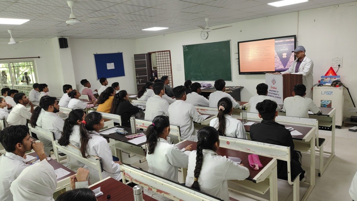 “Index Department of Physiotherapy and Paramedical Sciences, Malwanchal University, Indore, celebrated Constitution Day on 26/11 with great enthusiasm and patriotism. The event aimed to educate students about the significance of the Indian Constitution and its importance in shaping the country’s future.